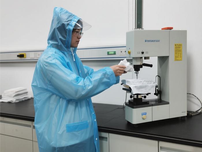 物理性能检测中,拉伸强度用拉伸试验机测试,按标准设定参数测断裂拉力等数据;厚度检测用高精度测厚仪,平稳放置材料读厚度值。